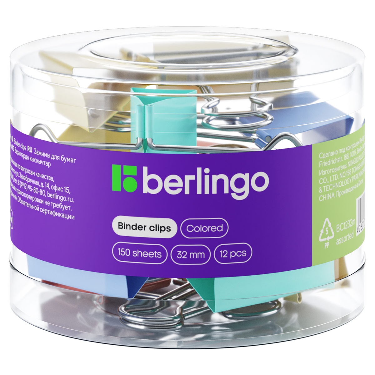 Зажим 32мм 12шт/уп.цветные пластиковый тубус Berlingo 1232m